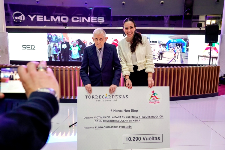 El broche final fue la entrega del talón con el número de vueltas del Centro Comercial Torrecárdenas a la Fundación Jesús Peregrín, con un total de 10.290 vueltas. La encargada de entregarlo fue Nadia Fernandes y lo recibió D. Jesús Peregrín, presidente de la Fundación.