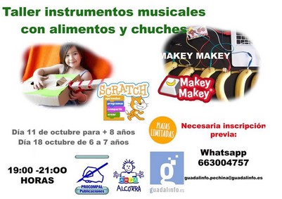El centro Guadalinfo de Pechina realizará los días 11 y 18 de octubre sendos talleres dirigidos a niños y niñas mayores de 8 años y de 6-7 años, respectivamente, con los que aprenderán a programar y construir instrumentos musicales con alimentos usando la tecnología Makey-Makey. El de Pechina es uno de los 95 centros de la red Guadalinfo de Almería, impulsada por la Consejería de Economía, Conocimiento, Empresas y Universidad y las diputaciones andaluzas.