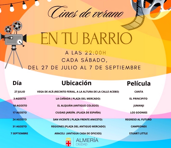 En total, se realizarán siete proyecciones con comienzo el sábado 27 de julio en el Recinto Ferial de la Vega de Acá. El 3 de agosto la actividad se trasladará a la plaza del mercado La Cañada; el, 7 al centro vecinal (antiguo colegio) de El Alquián; el 10, a la Plaza de España de Ciudad Jardín; el 17, a San Vicente; el 24 a la plaza del antiguo mercado de Regiones y, el 31 de agosto, a la antigua casa de oficios del barrio de Araceli.