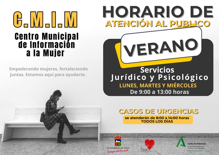 Por otra parte, el Centro Municipal de Información a la Mujer de Vícar ha modificado sus horarios de atención en los meses de verano, estableciendo los lunes, martes y miércoles como días de atención tanto jurídica como psicológica, en horario de 9 a 13.00 horas, si bien los casos urgentes tendrán respuesta todos los días de la semana desde las 8.00 a las 14.00 horas. Además, desde el CMIM se recuerda que están disponibles las 24 horas del día los 365 días del año los teléfonos gratuitos y confidenciales de atención a la mujer, 900200999, el 016 y la línea de WhatsApp 600000016.