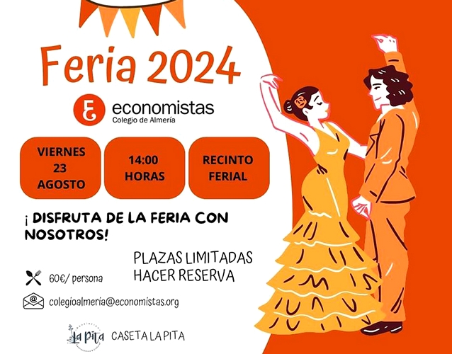 – El Colegio Profesional de Economistas de Almería va a celebrar un encuentro profesional en la próxima Feria y Fiestas de Almería en honor a su patrona, la Virgen del Mar. Será el segundo viernes de Feria, el 23 de agosto, con una comida en la Caseta La Pita, a partir de las 14.00 horas, previa reserva a través del correo electrónico colegioalmeria@economistas.org. Una iniciativa con la que el colectivo quiere “dar ejemplo” y que se recupere “una tradición habitual entre los distintos colectivos de la provincia durante las fiestas patronales de la capital”, apuntan desde el Colegio.
