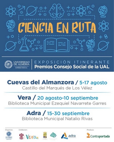 La exposición itinerante ‘Ciencia en Ruta’ se podrá contemplar en el Castillo del Marqués de Los Vélez de Cuevas del Almanzora del 5 al 17 de agosto. En Vera estará expuesta del 20 de agosto al 10 de septiembre en la Biblioteca Municipal Ezequiel Navarrete Garres, y en Adra se podrá visitar del 15 al 30 de septiembre en la Biblioteca Municipal Natalio Rivas. Colaboran los Ayuntamientos de los tres municipios.