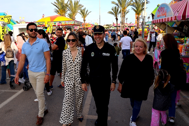 La edil de Cultura, Elena Gómez, acompañada por los concejales del equipo de Gobierno David Fernández y María del Mar Martínez, y el intendente de la Policía Local, Marco Muñoz, ha realizado un recorrido por el recinto ferial, en el que este año hay cerca de un centenar de instalaciones, entre atracciones y puestos lúdicos o de venta.