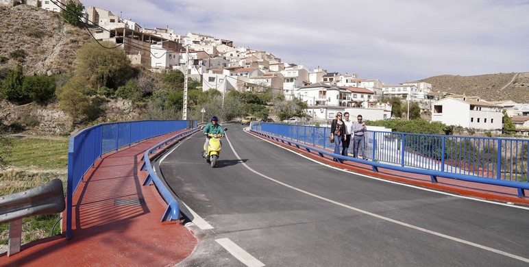 El diputado de Fomento, Antonio J. Rodríguez, acompañado por el alcalde de Líjar, Sergio Sánchez, y la teniente de alcalde de la localidad, María Dolores Hernández y por técnicos de la Institución, ha comprobado el estado del curso de los trabajos de ampliación a dos carriles del puente de la zona sur del municipio, una infraestructura de elevado tránsito de vehículos.