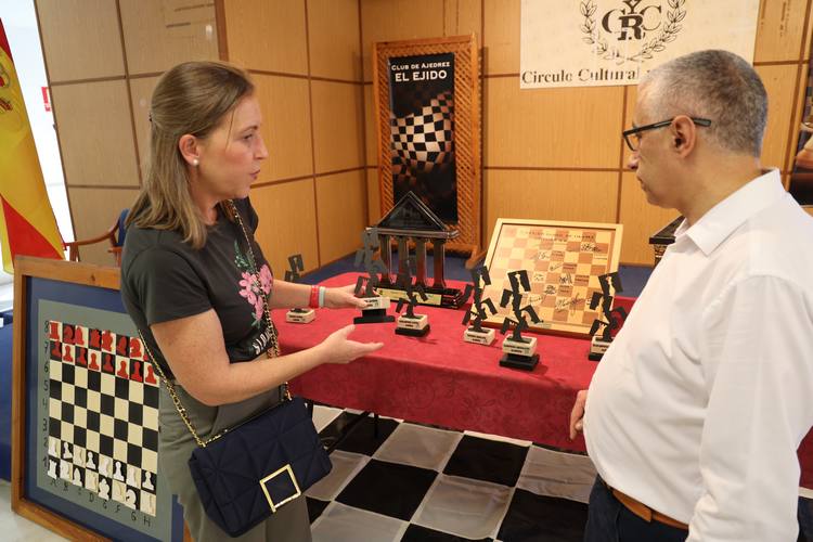 La concejal de Deportes ejidense, María José Martín, acudió para comprobar in situ cómo se estaba llevando a cabo una de las siete rondas de partidas lentas de 90 minutos más 30 segundas por cada movimiento, lo que ha llevado a que algunas de estas partidas hayan tenido una duración media en torno a cuatro horas.