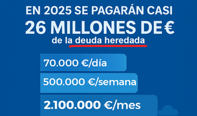 El Ayuntamiento en 2025 ha dejado de estar en situación de riesgo financiero, y destinará durante este año al servicio de la deuda casi 26 mill/€, es decir, 70.000€ al día y más de 2,1 mill/€ al mes. “Con ese dinero podríamos haber acometido más inversiones, mejorar o implementar nuevos servicios”