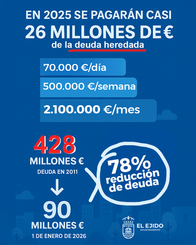 El Ejido destina 500.000 € a la semana a pagar la deuda heredada que a 1 de enero de 2026 se habrá reducido de 428 a 90 mill/€