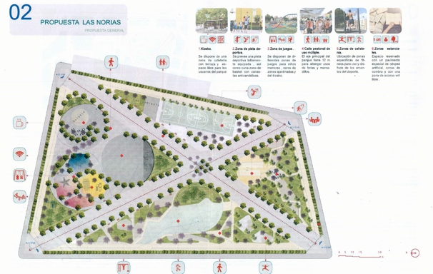 De este modo, en cuanto al proyecto, cabe destacar que el nuevo Parque Municipal de Las Norias va a tener aproximadamente 22.530 metros cuadrados y se va a ubicar en unos terrenos centrales del núcleo urbano, próximo a la Carretera de La Mojonera y del Consultorio de Las Norias, junto a espacios deportivos del Campo de fútbol y del Pabellón Polideportivo.