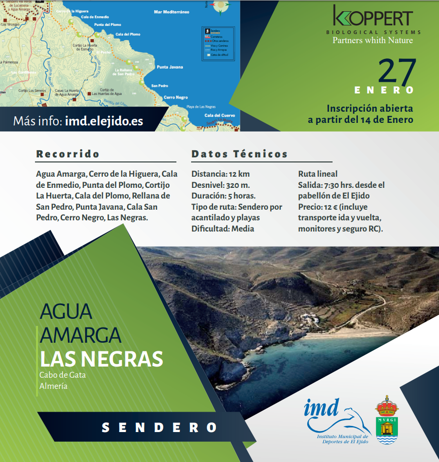 La salida será a las 7.30 horas de la mañana desde el Pabellón de Deportes hasta el inicio del recorrido en Agua Amarga para seguir por Cerro de la Higuera, Cala de Enmedio, Punta del Plomo, Cortijo La Huerta, Cala del Plomo, Rellana de San Pedro, Punta Javana, Cala San Pedro, Cerro Negro y las Negras.
