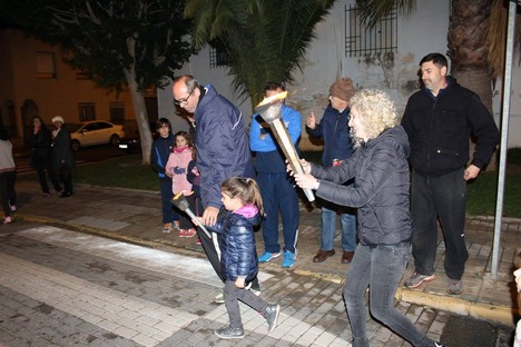 A partir de las 19.00 horas se procederá al encendido de la antorcha, en la Plaza de la Biblioteca, desde donde un grupo de corredores serán los encargados de portar el fuego por relevos y en parejas formadas por un adulto y un niño, en un recorrido por algunas calles de la localidad hasta su llegada junto al Centro Cultural a las 20.00 horas para el encendido de la gran hoguera.