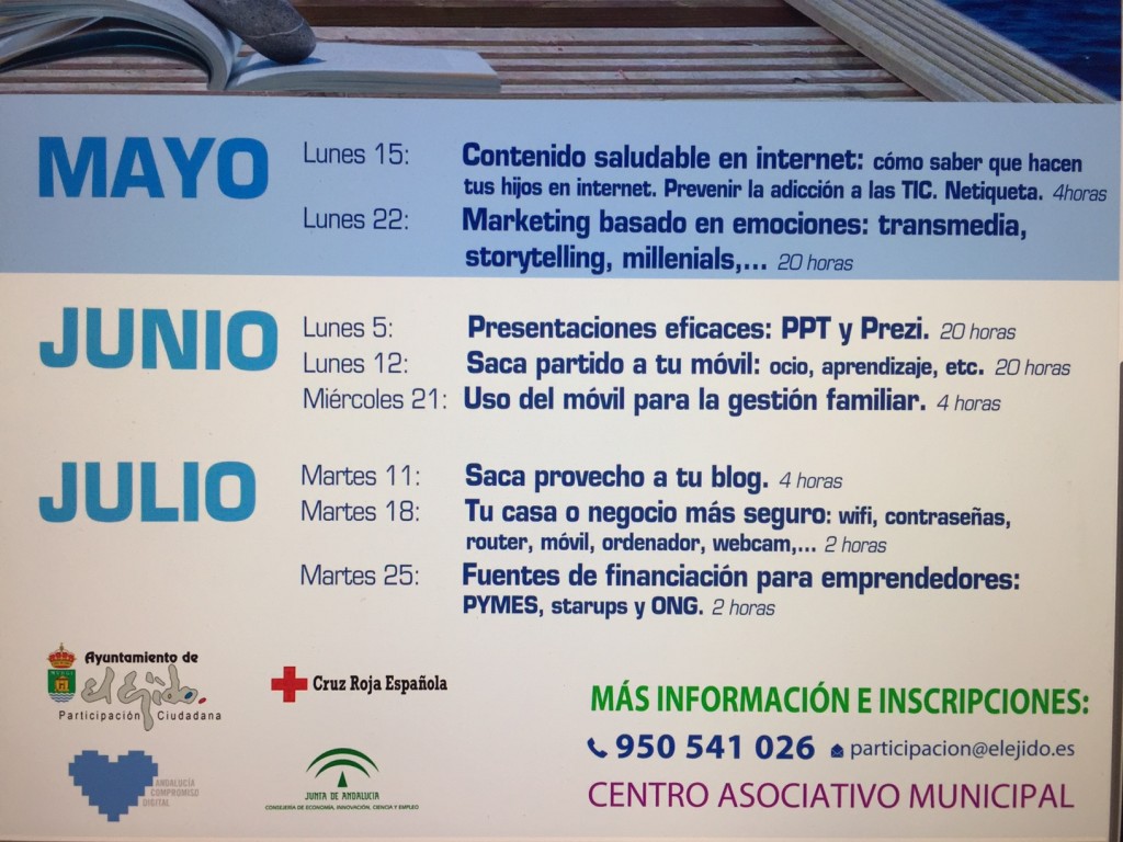 De manera previa a estas dos actividades dirigidas al uso del teléfono móvil, Participación Ciudadana y Andalucía Compromiso Digital han organizado el curso de ‘Presentaciones eficaces: PPT y PREZI’, con 20 horas lectivas, del 5 al 8 de junio en el Centro de Profesores.