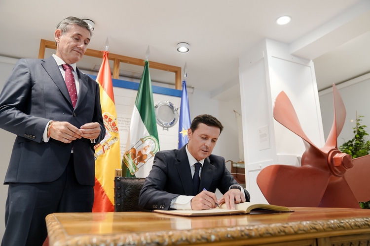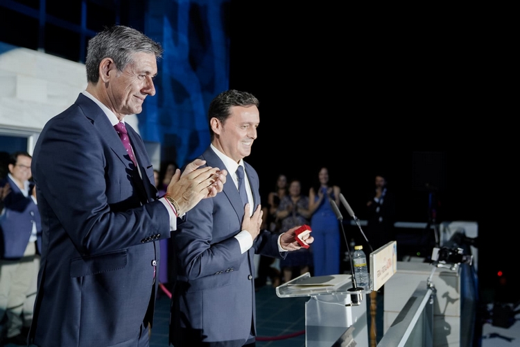 Tras la firma en el Libro de Honor, Cortés ha entregado a Javier Aureliano García la moneda de Adra y, al finalizar el pregón, le ha impuesto el pin de oro de la ciudad, en señal de reconocimiento por su dedicación y vinculación con la localidad.