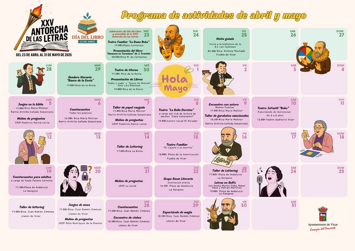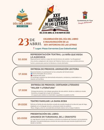 “Queremos que en cada rincón de nuestro pueblo el hábito noble de la lectura se convierta en algo cotidiano y por eso hemos querido trasladar el espíritu de nuestra Antorcha de las Letras a cada barrio de Vícar”, ha señalado Antonio Bonilla, tras dar a conocer la programación de las actividades municipales con motivo del Día del Libro y la vigésimo quinta edición de Antorcha de las Letras, cuyo encendido tendrá lugar mañana en la Plaza Cervantes de Las Cabañuelas. Con ello da comienzo una amplia programación de actividades para conmemorar el Día del Libro que se desarrollarán tanto en el teatro, como en las distintas bibliotecas y espacios públicos del municipio durante los meses de abril y mayo.