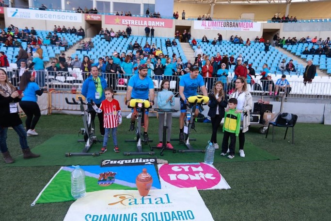 El momento más emocionante se ha producido cuando se ha puesto la cuenta atrás en el vídeo marcador del estadio para que se cree una gran expectación y los dos valientes puedan recibir el reconocimiento de todo el público por el reto de spinning. Los deportistas han contado con el apoyo del Patronato Municipal de Deportes y la UDAlmería, que ha regalado la recaudación de 200 entradas para el partido ante el Córdoba y ha sorteado de camisetas firmadas por los jugadores, así como más de un centenar de patrocinadores.