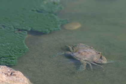 En una visita realizada a la desembocadura de Rambla Morales (Parque natural de Cabo de Gata-Níjar), aparte de la abundancia de algas, suponemos que debido a los procesos de eutrofización que suelen producirse en esta época del año, hemos observado la presencia de numerosos ejemplares de cangrejo azul, especie exótica que, como hemos dicho, causa importantes cambios en el ecosistema. Es más, en este lugar donde en otras ocasiones hemos observado la presencia de numerosas especies de aves, en esta ocasión solo hemos podido observa a dos y a mucha distancia para poder ser identificadas.