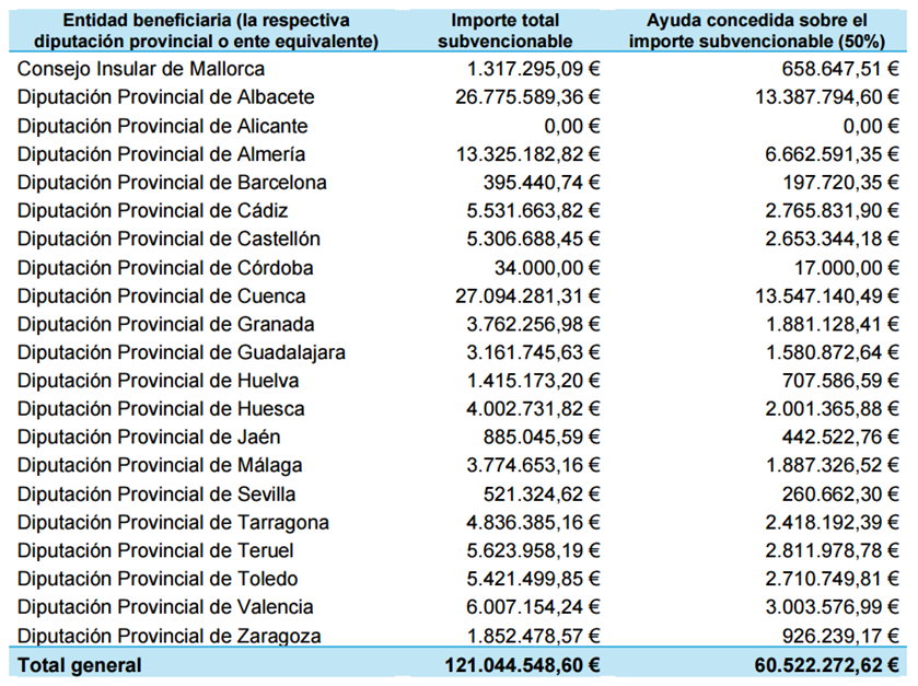 Las subvenciones convocadas tienen por objeto financiar en un 50% los proyectos directamente relacionados con los daños de la DANA que ejecuten los ayuntamientos, los consejos insulares, las diputaciones provinciales, las comarcas y las mancomunidades. Serán obras de restitución de infraestructuras, equipamientos o instalaciones y servicios municipales y de las mancomunidades, además de en Andalucía, en la Comunitat Valenciana, Castilla-La Mancha, Illes Balears, Cataluña y Aragón. En total, se distribuirán a estos territorios afectados 60.522.272,62 euros.