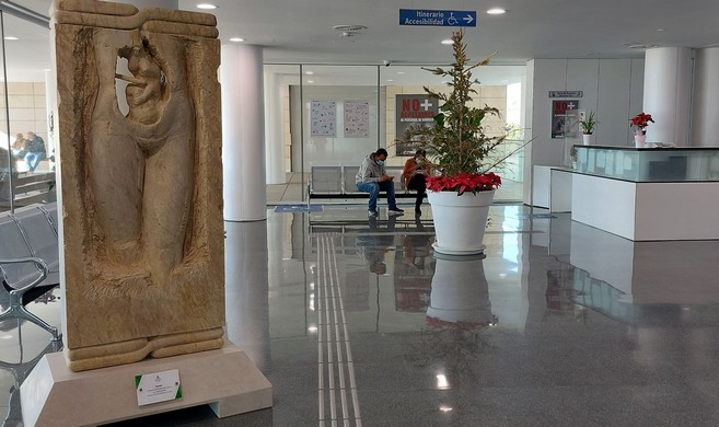 La obra, en mármol amarillo de Macael, representa a una mujer embarazada y está situada en la recepción del centro hospitalario.