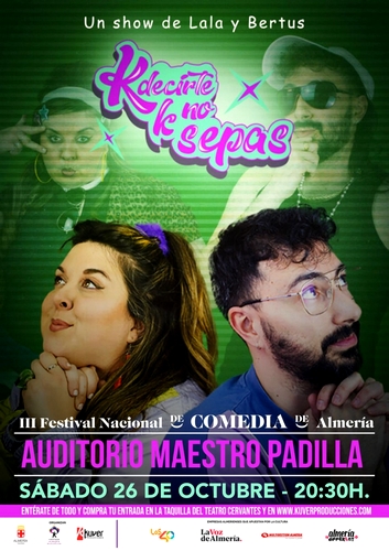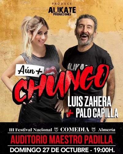 La iniciativa de Kuver Producciones con el apoyo del Área de Cultura, Tradiciones y Fiestas Mayores del Ayuntamiento de Almería y de la Diputación Provincial a través de Costa de Almería contará este viernes, 25 de octubre, con el dúo cómico ‘Los Compadres’ y su nuevo “Somos Carajotes”, con Lala Chus y Bertus en “Qué decirte que no sepas” el sábado 26; en ambos casos con inicio a las 20.30 horas, y con Palo Capilla y todo un ganador de dos Goya, Luis Zahera y “Aún + Chungo”, el domingo, 27 de octubre, en este caso con inicio a las 19.00 horas.