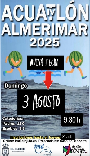 La Playa de Poniente de Almerimar acogerá este próximo domingo la celebración de su IV Acuatlón, después de que la prueba tuviera que ser aplazada el pasado 20 de julio por la previsión de mala mar.
