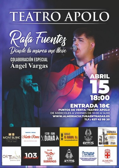 La programación trimestral del Área de Cultura y Educación del Ayuntamiento de Almería siempre tiene espacio para que artistas de la ciudad puedan mostrar sus nuevas creaciones y proyectos y así ocurrirá una vez mes en esta Primavera Cultural este sábado, 15 de abril, a partir de las 18.00 horas en el Teatro Apolo de la capital con el concierto que ofrecerá el joven de 18 años Rafa Fuentes, que presentará su single “Donde la marea me lleve”.
