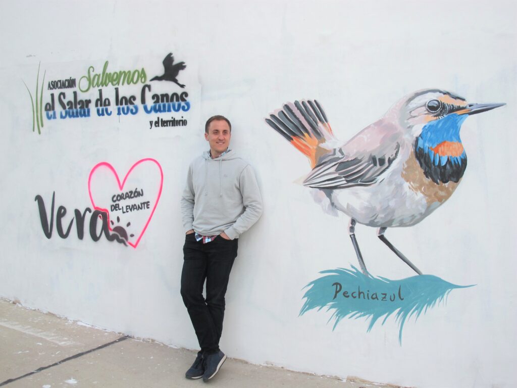 La artista Rocía Gilabert que el año pasado, en la primera edición del Festival, realizó el mural titulado “Conciencia Ecológica” con una obra con cinco retratos de aves residentes en el Salar de los Canos: Martinete, Martín Pescador, Malvasía Cabeciblanca, Cigüeñuela y Calamón, ha continuado el mural incluyendo nuevas especies como flamencos, petirrojos, abubillas y pechiazul, además de incluir los logos del Ayuntamiento de Vera y la Asociación Salvemos el Salar de los Canos y el Territorio.