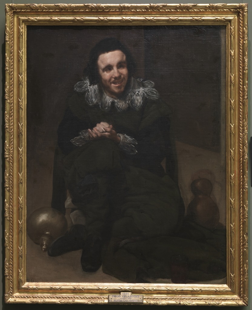 Según recoge la ficha técnica del Mueso del Prado, ‘El bufón Calabacillas’ (1635-1639) es un óleo sobre lienzo que retrata a Juan Calabazas que sirvió primero como bufón del cardenal infante don Fernando de Austria y en 1632 pasó al servicio del rey, para morir siete años más tarde. Es uno de los varios retratos de bufones de Velázquez que basan su eficacia comunicativa en la presencia imponente del personaje en un primerísimo primer plano, su ubicación en un lugar indeterminado, su extraña y casi descoyuntada postura y su expresión insólita. En esta obra destaca el tratamiento técnico, sobre todo de la cabeza, realizada a base de un eficaz difuminado.