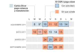 El Consejo General del Poder Judicial pagó a su presidente, Carlos Dívar, estancias de cuatro días en Marbella (Málaga) con viaje, alojamiento y manutención incluidos, para acudir a actos públicos de unas horas que, a veces, se celebraban en una provincia distinta y, en algunos casos, a 200 kilómetros de distancia por carretera. Para justificar estas irregularidades, Carlos Dívar alegó que es presidente las 24 horas del día y que algunos viajes eran de carácter “reservado”.