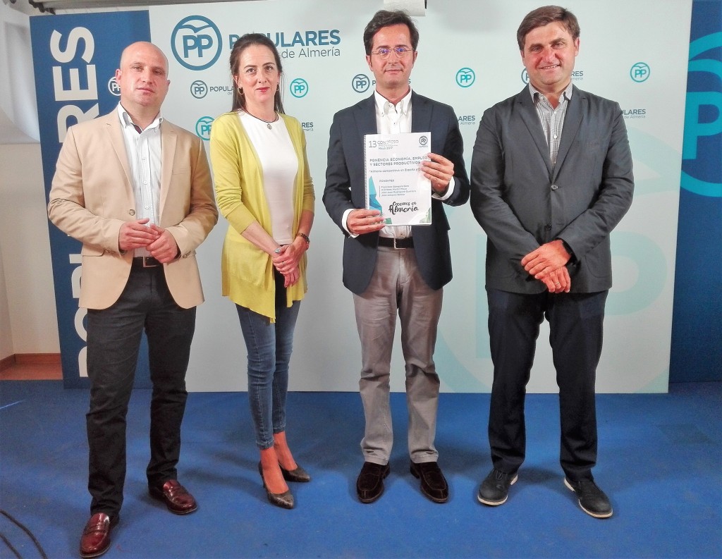 martes por la mañana ha tenido lugar en la sede provincial del PP de Almería la presentación de la Ponencia sobre Economía, Empleo y Sectores Productivos elaborada por el alcalde de El Ejido, Francisco Góngora, la parlamentaria andaluza Aránzazu Martín, el concejal de Roquetas de Mar José Juan Rodríguez, y el concejal del Ayuntamiento de María, José Antonio García.