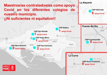 En el caso del municipio de Adra, el PSOE ha informado de que el reparto de docentes por apoyo Covid que la consejería de Educación ha realizado consiste en dos docentes de apoyo Covid para los centros Mare Nostrum y San Fernando; un docente de apoyo para los centros Abdera, Pedro Mena y San Nicolás; y ningún docente de apoyo para los centros Fuentesantilla, Nueva Andalucía y Alboraida.