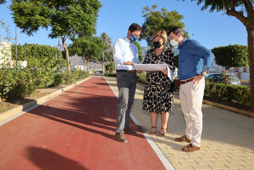 El alcalde de El Ejido, Francisco Góngora; junto al concejal de Obras Públicas, Servicios y Mantenimiento, Alberto González; y técnicos municipales, ha comprobado estos días el avance de las obras, que han consistido básicamente en la sustitución del albero existente por pavimento aglomerado en el área destinada al carril bici y adoquín en el trazado destinado a la zona de paseo. Igualmente se ha dotado de señalización tanto vertical como horizontal y en los próximos días, se instalará mobiliario urbano, consistente en papeleras y bancos.