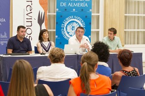 El Patio de Luces de la Diputación Provincial de Almería acogió este miércoles una de las sesiones del Curso de Verano de la Universidad de Almería ‘Cultura del Vino’ que tiene como sede Almería. La ponencia impartida en el Palacio Provincial ha sido presentada por el diputado provincial, Óscar Liria; los ponentes, Sonia Suárez -especialista en medicina de familia y microbiología- y Francisco Bravo Castillo -especialista en Aparato Digestivo-, y el director del curso, Rafael Rubio.