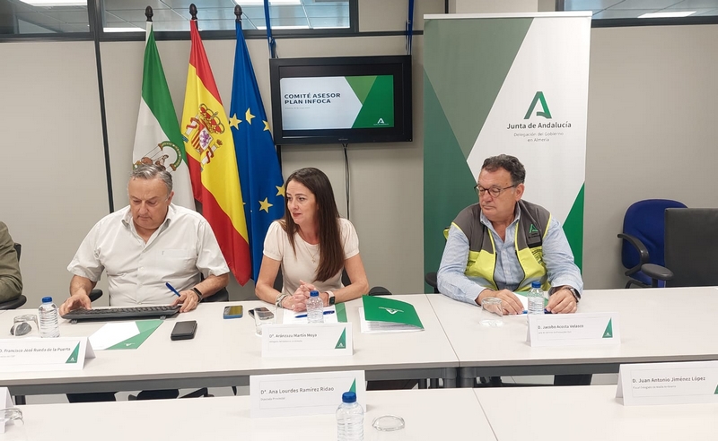 La delegada del Gobierno de la Junta de Andalucía en Almería, Aránzazu Martín, ha presidido este miércoles el Comité Asesor Provincial del Plan Infoca, donde se han presentado los recursos con los que contará el dispositivo para afrontar el periodo de alto riesgo de incendios forestales, que va desde el 1 de junio hasta el 15 de octubre y durante el que estará prohibido usar fuego, así como el tránsito de vehículos a motor por zonas forestales y de influencia forestal (franja de 400 metros).