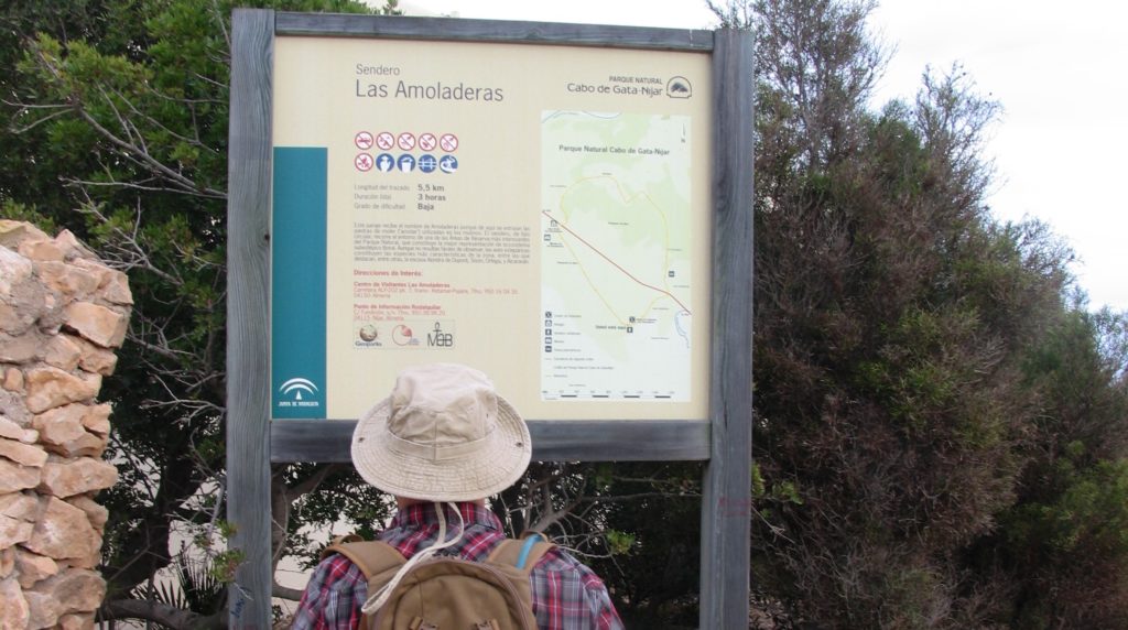 El recorrido se iniciará desde detrás del Centro de Visitantes Las Amoladeras, y, en el primer momento, atravesarán una zona de dunas fijadas por la vegetación donde destacan grandes ejemplares de azufaifos, tarajes, pitas (agaves) que fueron introducidas como fuente de fibra natural a mediados del siglo XX, para intentar fomentar la economía deprimida de la zona, aunque fueron abandonados a los pocos años debido a la aparición de la fibra sintética, y especies de matorral semiárido.