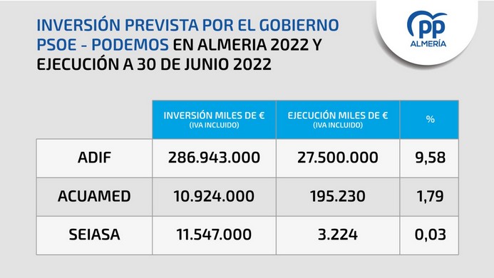 “A Almería le caen lluvias de millones cada vez que se aprueban unos presupuestos, pero la realidad es que la ejecución es bajísima”, ha afirmado.