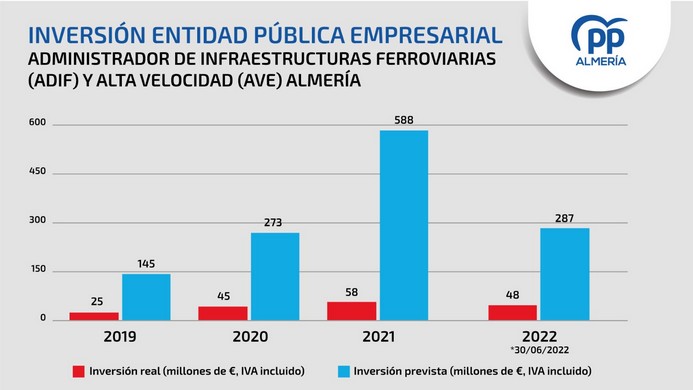 Los senadores del PP de Almería, Rafael Hernando y Luis Rogelio Rodríguez, y el diputado nacional del PP, Miguel Ángel Castellón, han denunciado este viernes la “ridícula” ejecución presupuestaria del AVE en la provincia de Almería durante los primeros seis meses del año 2022, ya que tal y como ha reconocido el propio Gobierno en una respuesta parlamentaria de los 287 millones presupuestados para este año sólo se han ejecutado a 30 de junio 47,6 millones de euros, lo que según Hernando demuestra que “el Gobierno lejos de acelerar las obras del AVE las está retrasando”.