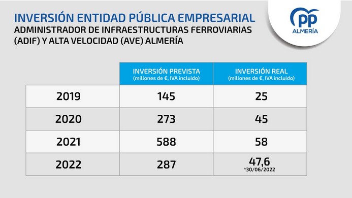 “No vamos a esperar a que llegue otro Gobierno para que parezca que es el que retrasa la llegada del AVE a Almería, cuando es la inejecución de los Gobierno de Pedro Sánchez la que está poniendo en peligro la llegada del AVE a la provincia”, ha concluido.