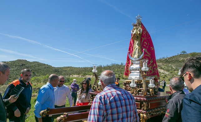 Representantes de la Hermandad de la Virgen de la Cabeza encabezados por su presidenta Remedios García, así como el alcalde de Benizalón Emilio Cid, se desplazaron a primera hora de la mañana al Santuario ubicado en el cerro de Monteagud, donde tuvo lugar una sencilla ceremonia religiosa antes de trasladar la imagen desde su camarín a un vehículo municipal con remolque.