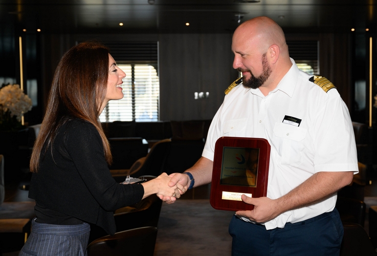 La presidenta de la Autoridad Portuaria de Almería (APA), Rosario Soto, ha visitado este jueves al Scenic Eclipse, donde ha sido recibida por el capitán Ned Tutton; ambos han procedido al tradicional intercambio de metopas con motivo de la primera visita del barco al Puerto de Almería. Soto, acompañada por el concejal de Turismo, Comunicaciones y Promoción de la Ciudad, Joaquín Pérez de la Blanca, y el gerente de la Fundación Bahía Almeriport, Fabio Laborda, ha dado la bienvenida a la tripulación y ha agradecido la apuesta de la naviera Scenic Yacht Club por Almería.