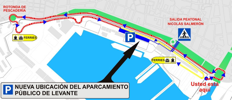 El parking público estará disponible en la nueva localización, a poniente de la estación marítima, a partir del 27 de enero. El acceso en vehículo se realizará por la rotonda de Pescadería, mientras que la entrada y salida peatonal estará habilitada en la puerta de las instalaciones portuarias frente a la rotonda de la Fuente de Los Peces de Perceval.