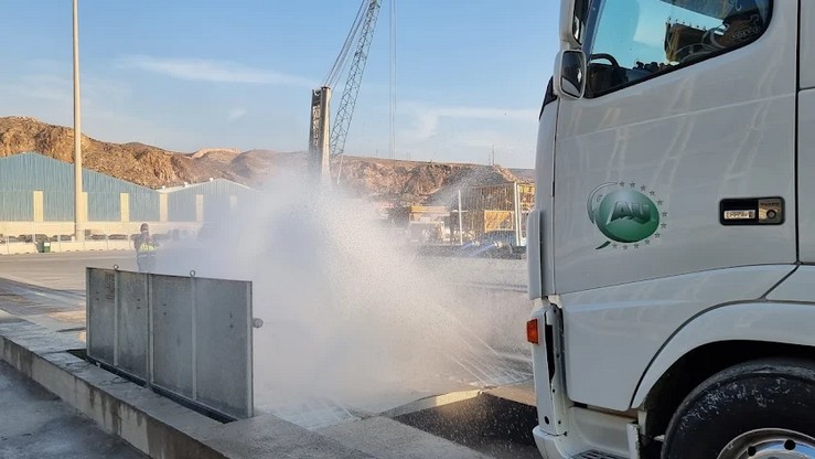 La estación lava-ruedas, como las dos que se han puesto en servicio en el Puerto de Almería, tiene como objetivo reducir las emisiones de partículas durante el traslado de material adherido a los neumáticos y a los bajos de los camiones que transportan la mercancía a granel. De esta manera, se mejorará la limpieza de los viales.