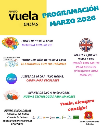 El centro Punto Vuela Dalías ha dado a conocer su programación de actividades para el mes de marzo de 2026, una oferta formativa orientada a fomentar las competencias digitales entre la ciudadanía y acercar las nuevas tecnologías a personas de todas las edades, fiel a su compromiso con la formación y la inclusión digital mediante diferentes talleres y servicios que se desarrollarán a lo largo de toda la semana.