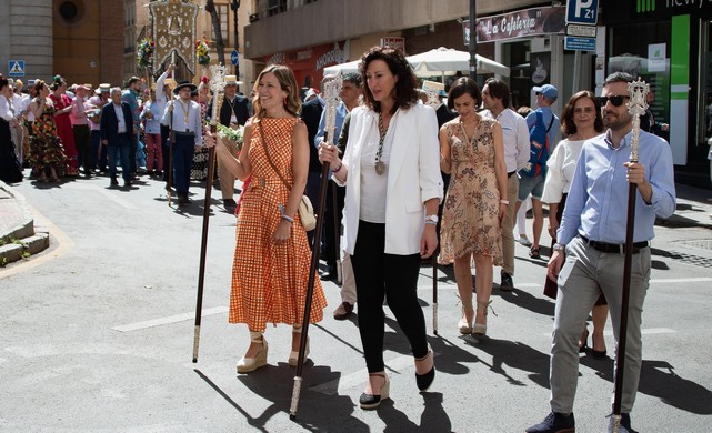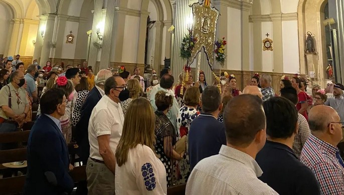 Finalizada la Misa de Romeros ha comenzado el cortejo procesional, recibiendo el Simpecado a su salida del templo parroquial la interpretación del Himno Nacional interpretado por la Banda de Cornetas y Tambores de “Santa Cruz”, camino de la Iglesia de Santiago Apóstol que fue recibida la Hermandad del Rocío por la Ilustre Hermandad del Santísimo Sacramento y Nuestra Señora de los Dolores, bajo la dirección espiritual del canónigo archivero y párroco Francisco Escámez Mañas, rezándose con unción en el interior del templo ante el Sagrario y ante la imagen de la dolorosa del Viernes Santo en la capilla de Santa Lucía.