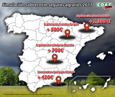 Según las estimaciones realizadas por los técnicos del Área de Seguros Agrarios de COAG en las distintas uniones regionales, en una explotación tipo de 5 hectáreas de frutales en Aragón, una póliza que tuviera un coste total de 4.200 euros vería incrementado el mismo hasta los 4.700, (+500 euros). Por su parte, un viticultor manchego, con una explotación media de 200.000 Kg de uva, podría pasar de un coste total de 3.3300 a una póliza por encima de los 4.000 euros (+ 700 euros). En Almería, un productor de calabacín con un invernadero de 1 hectárea pasaría de tener un coste de la póliza de 1.400 euros a 1.820, (+420 euros). Asimismo, en una explotación media de frutales en Lleida, el coste pasaría de 13.500 euros a 15.800 (+ 2.300, 2.990 si se tiene en cuenta la rebaja de la subvención autonómica ligada a la de ENESA). (Ver infografía que se adjunta en mail).