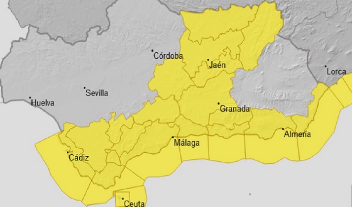El nivel amarillo por tormentas seguirá también vigente en Cádiz y Málaga, por viento en Cádiz y Almería y por fenómenos costeros en Málaga, Almería, Granada y Cádiz.