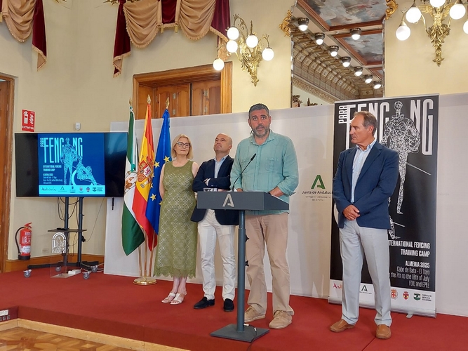 El delegado territorial de la Consejería de Cultura y Deporte, Juan José Alonso, ha presentado este miércoles en la sede de la Delegación del Gobierno de la Junta de Andalucía, el International Fencing Training Camp que se celebrará del 7 al 18 de julio en el Pabellón y Palacio de Congresos de El Toyo. Junto a Alonso han estado el diputado de Deportes, Vida Saludable y Juventud, José Antonio García; el concejal de Ciudad Activa, Movilidad urbana y Deportes del Ayuntamiento de Almería, Antonio Jesús Casimiro Andújar y la presidenta de la Federación Andaluza de Esgrima, Astrid Ferrando.