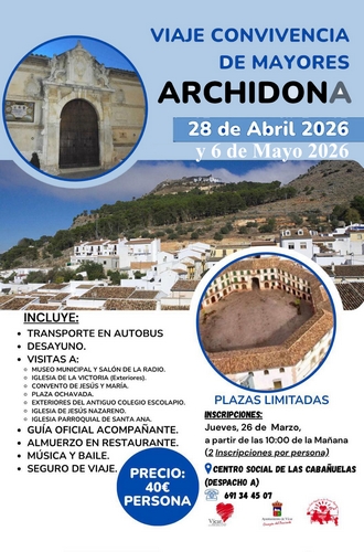 El área de Servicios Sociales del Ayuntamiento de Vícar informa que ante el gran número de solicitudes presentadas para el próximo viaje de convivencia de mayores, se ha decidido ofertar una segunda cita para este viaje con destino a la localidad malagueña de Archidona. Los dos viajes tendrán lugar los días 28 de abril y 6 de mayo próximos. El periodo de inscripción para esta segunda cita se abrirá el próximo día 7 de abril, y será entonces cuando las personas interesadas puedan inscribirse en el Centro Social de Las Cabañuelas (despacho A), o bien a través del teléfono 691344507.