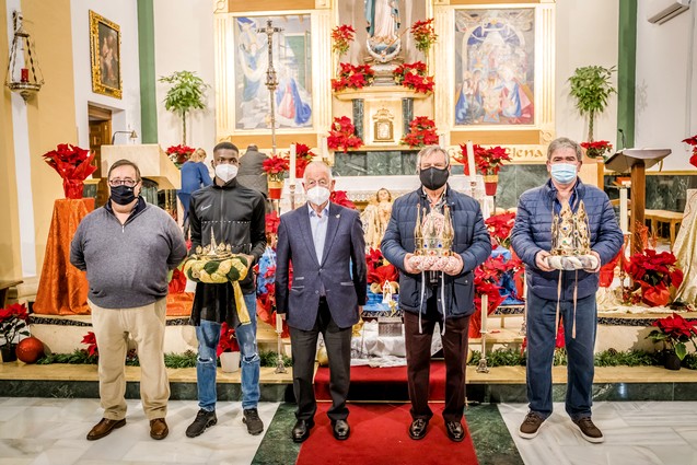 Guillermo Visiedo, Bakary Kone y Francisco Fuentes reciben con emoción las coronas por parte del alcalde, Gabriel Amat, quien confía en celebrar una cabalgata segura.