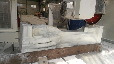 La ejecución del trabajo se está desarrollando en dos fases claramente diferenciadas; una primera fase de corte, desbaste y mecanizado en un centro de mecanizado de 5 ejes gobernado por CNC (control numérico computarizado), en la que se parte de tres bloques de mármol cedidos por la empresa Cosentino -uno para cada mano, con alrededor de 170 cm de altura, y otro para la peana, de 20 cm de altura-; y una segunda fase de talla, acabado manual y montaje.