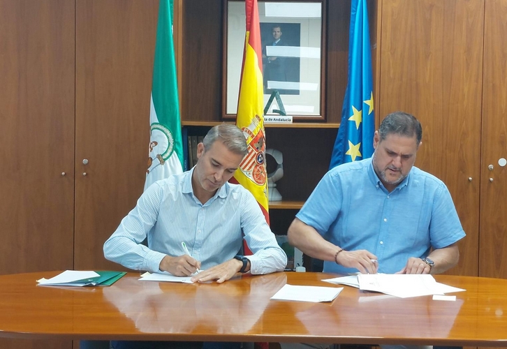 El delegado territorial de Empleo, Empresa y Trabajo Autónomo y director provincial del Servicio Andaluz de Empleo (SAE), Amós García Hueso, y el delegado territorial de Desarrollo Educativo y Formación Profesional y de Universidad, Innovación e Investigación, Francisco Alonso Martínez, han firmado un acuerdo de colaboración con una vigencia inicial de cuatro años que regula el uso compartido de instalaciones y equipos.