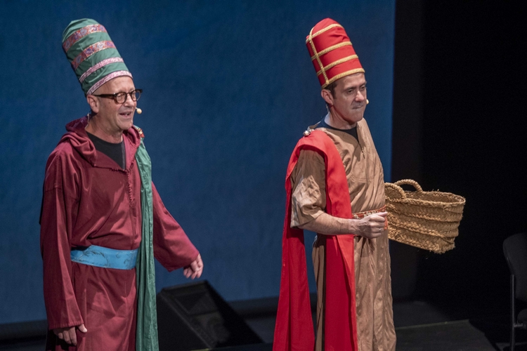 A través de once cuadros escénicos, ‘Erase una vez Almería’ narra la historia de la provincia, desde el neolítico hasta nuestros días, en una crónica irreverente y muy divertida, donde no pueden faltar iconos de la cultura pop almeriense como el Lengüetas, el Kiosko Amalia, la Alcazaba o el deseado AVE. Por el escenario del Auditorio Maestro Padilla se pasearon anoche Neolíticos, Fenicios, Romanos, Árabes, Cristianos, Raperos que cantan y cuentan la edad moderna, Bandoleros, Arquitectos impulsores de la ciudad, ciudadanos de a pie, vendedoras de pescado, madres de ‘la desbandá’… Una serie de estereotipos interpretados por Kikín Fernández y Fernando Labordeta, cuya interpretación bordan y los llevan a su terreno para compartir su característico sentido del humor, sacando a la luz la forma de ser tan particular que tenemos de ver la vida en esta tierra. Un texto muy divertido, salpicado con alguna crítica, como es el mal endémico de la lentitud en desarrollarse los proyectos que sufre Almería, especialmente el AVE, que, según esta historia, ya se reclamaba en la Antigua Roma.